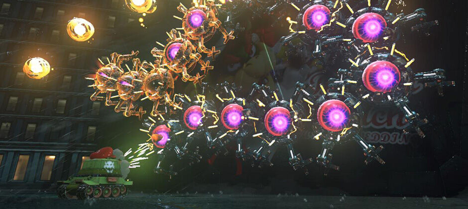 A massive monster, known as the Mecha Wiggler, has attached itself to the very height of New Donk City City Hall. After climbing to the top of the building, a boss battle volition begin. In society to impairment the Mecha Wiggler, Mario must capture a Sherm (the tank beast) and apply its ability to shoot at all of the growing segments of the monster's body. The boss volition crawl beyond the face of the building firing big energy balls at Mario.
